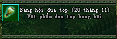 Hoàn thành 40 nhiệm vụ dã tẩu : Nhận 2 Lệnh bài đua top bang hội ( Khóa ) Boss tiểu hoàng kim : Nhận 10 lệnh bài đua top bang hội ( Khóa ) Tống kim đạt 5000 điểm tích lũy nhận 2 lệnh bài đua top bang hội ( Khóa ) Nhận 20 lệnh bài đua top bang hội khi kết thúc Loạn chiến ( Khóa ) Top 1 -> 10 nhận 5 lệnh bài đua top bang hội ( Khóa ) Long trụ 15 Lệnh bài đua top bang hội ( Khóa )