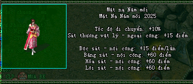 Mặt nạ năm mới ( 15 ngày ) Chiến mã 8x ( ngẫu nhiên ) Phi Phong Tống kim Bạch Chân Đơn ( Sử dụng nhận 50.000.000 EXP 1 nhân vật sử dụng 5 viên ) Huyết Chân đơn ( Sử dụng nhận 100.000.000 EXP 1 nhân vật sử dụng 4 viên ) Huyền Chân đơn ( Sử dụng nhận 150.000.000 EXP 1 nhân vật sử dụng 3 viên ) Kim thạch ( Hoán binh ) Túi bí kíp Cây thông luyện Skill Tiên thảo lộ đặc biệt Thủy tinh ( 3 Loại ) Nến Bát Trân Phúc Nguyệt ( Sử dụng x2 EXP trong vòng 30 phút ) Vật phẩm đua top cá nhân ( Không khóa ) Vật phẩm đua top bang hội ( Không khóa ) Hộp quà trang bị Tinh Hồng bảo thạch Thiết La hán Phúc duyên đại Mảnh Võ Lâm Mật Tịch Mảnh Tẩy tủy Kinh Võ Lâm mật tịch ( 1 quyển ) Tẩy tủy kinh ( 1 quyển ) Bàn nhược tâm kinh Tiên thảo lộ thường Quế hoa tửu Trang bị Kim Phong Thiên sơn bảo lộ Chiến mã 80 Thư Đặc Xá Triều đình Phiếu hoàn thành dã tẩu Tiểu thành bí kíp 9x ( Sử dụng tăng 1 cấp độ skill 9x ) Đại thành Bí Kíp 9x Tín vật môn phái Trường mệnh hoàn lễ bao Gia tốc hoàn lễ bao Đại lực hoàn lễ bao Cao thiểm hoàn lễ bao Phi Tốc hoàn lễ bao Băng Phòng Hoàn Lễ bao Lôi Phòng Hoàn Lễ bao Hỏa Phòng Hoàn Lễ Bao Độc Phòng Hoàn Lễ bao Hành Hiệp kỳ (1) Hành Hiệp kỳ (2) Hành Hiệp kỳ (3) Hành Hiệp kỳ (4) Hành Hiệp kỳ (5)