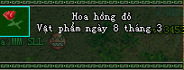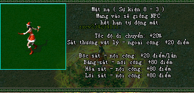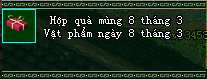 Nhận ngẫu nhiên 1 trong những phần quà dưới đây Tiên thảo lộ đặc biệt Thiên sơn tuyết liên 3 tử thủy tinh tín vật môn phái Võ Lâm mật tịch Tẩy tủy kinh Bạch ngọc Tử ngọc Bí kíp kỹ năng 21 Mặt nạ 8/3 ( 15 ngày )