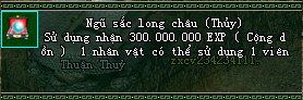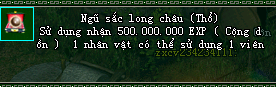 Sử dụng nhận 750.000 EXP ( Không cộng dồn ) Sử dụng tối đa x500 cái Đẳng cấp 60 trở lên có thể sử dụng |