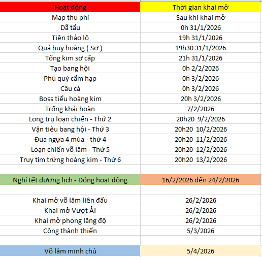 Tết âm lịch sẽ đóng tất cả các HĐ chính chỉ để lại hoạt động dã tẩu ( Có EXP ) và hoạt động Tống kim 21h ( Không thưởng EXP )